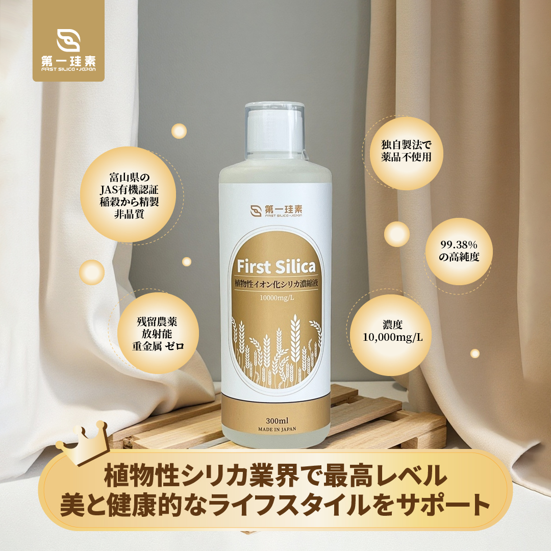 富山県のJAS有機認証を受けた稲穀から精製された非晶質のシリカ粉末×富山海洋深層水でイオン化シリカ濃縮液です。 独自の製法により薬品を一切使用せず、シリカ含有量は21,500mg/Lで美と健康的なライフスタイルをサポートするために設計されております。